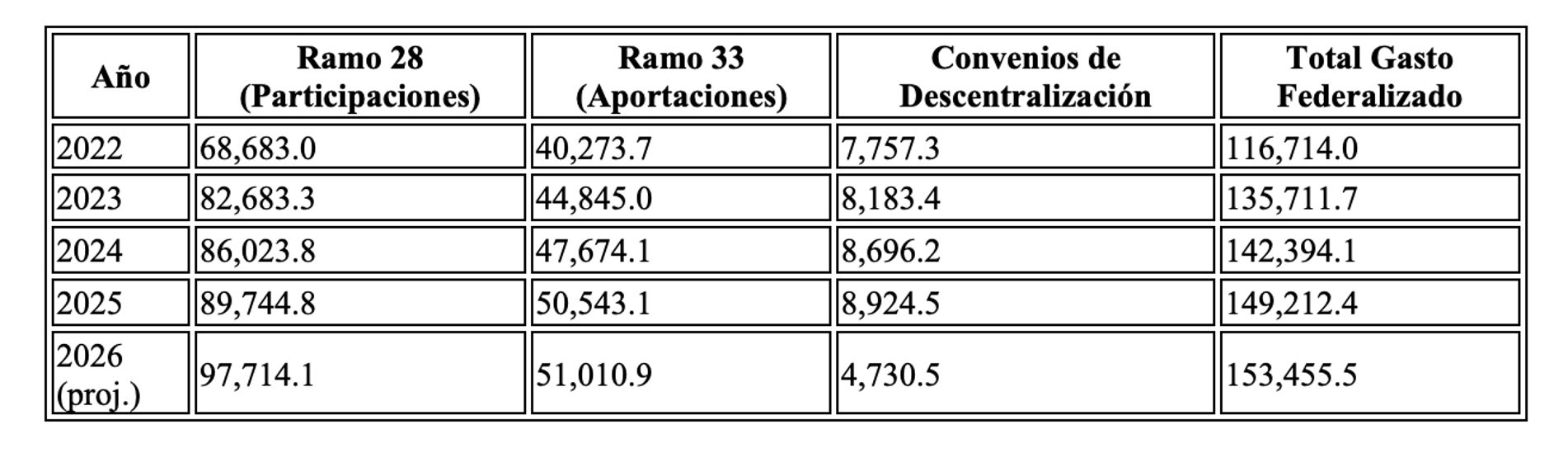 *Fuente: Elaborado con base en «Recursos para Jalisco 2022-2026.xlsx» y «Recursos del PEF 2026 para Jalisco.pdf» del CEFP. Valores en mdp. Nota: Datos de 2025 y 2026 ajustados a cifras aprobadas y proyectadas; leves variaciones por redondeo.