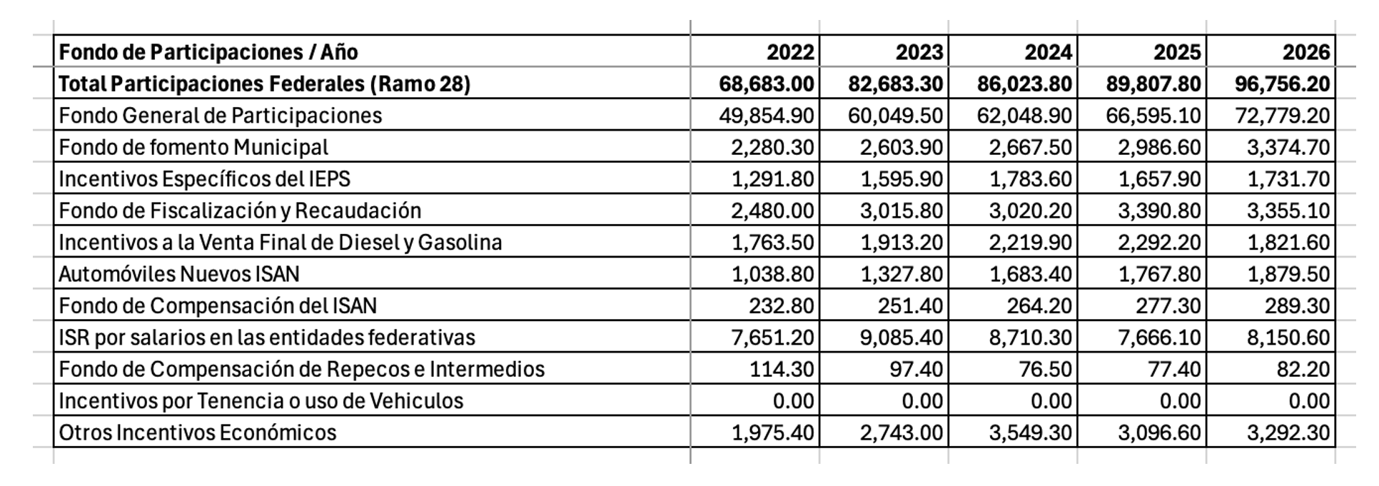 Este ramo, que representa alrededor del 64% de las transferencias a Jalisco en 2026, muestra un crecimiento robusto, pasando de 68,683 mdp en 2022 a 97,714.1 mdp en 2026. El incremento real para 2026 vs. 2025 es del 5.2%, impulsado por el Fondo General de Participaciones (72,779.2 mdp, +5.6% real) y el Fondo de Fomento Municipal (3,374.7 mdp, +9.2% real). Otros fondos como el de Compensación del ISAN crecen 0.8% real, mientras que incentivos específicos (IEPS, diesel/gasolina) no se desglosan en el proyecto, pero se agregan en «Otros Incentivos Económicos» (21,270.9 mdp).