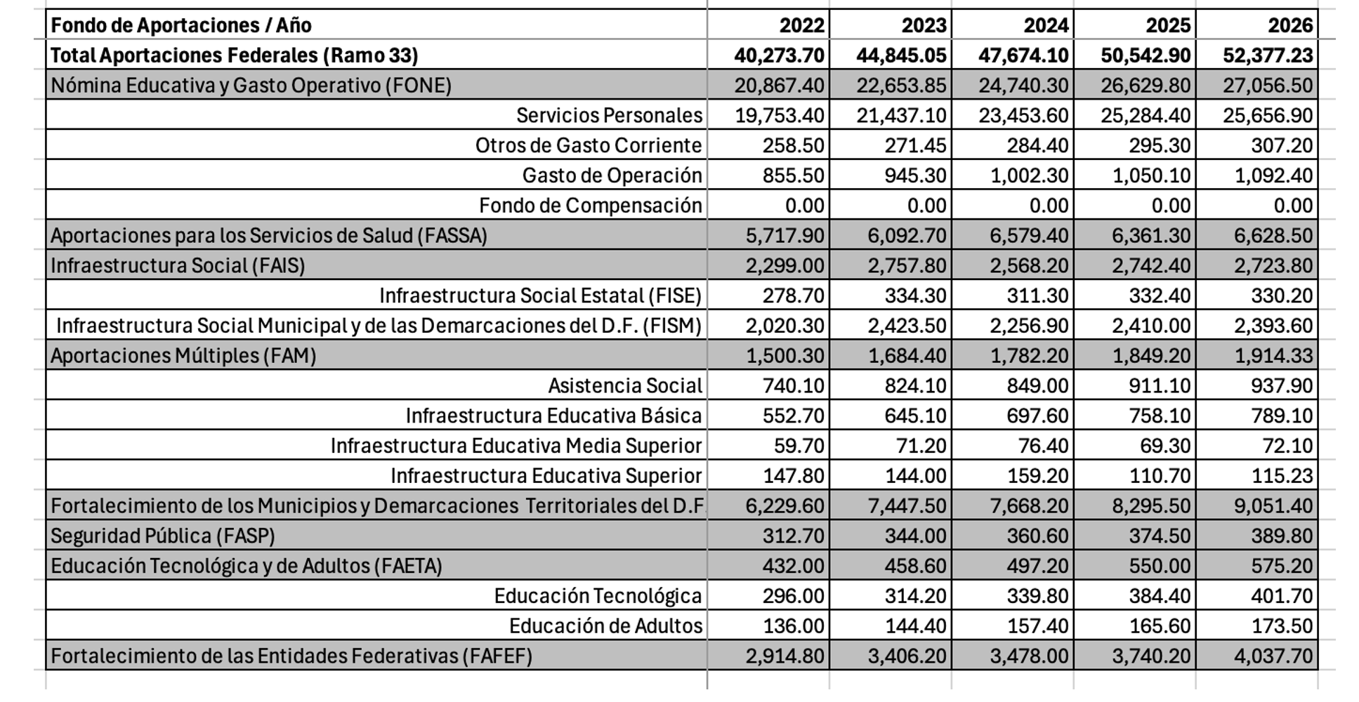 Destinadas a fines específicos, estas aportaciones aumentan de 40,273.7 mdp en 2022 a 51,010.9 mdp en 2026. Sin embargo, el incremento real para 2026 es negativo (-2.5%), con caídas en fondos clave como la Nómina Educativa y Gasto Operativo (FONE, 27,056.6 mdp, -1.8% real) y la Infraestructura Social (FAIS, 2,723.8 mdp, -4.0% real). En contraste, crecen el Fortalecimiento de Municipios (FORTAMUNDF, 9,051.4 mdp, +5.4% real), Servicios de Salud (FASSA, 6,628.5 mdp, +0.7% real) y Fortalecimiento de Entidades (FAFEF, 4,037.7 mdp, +4.3% real). Las Aportaciones Múltiples (FAM) caen drásticamente (-51.0% real), afectando infraestructura educativa.