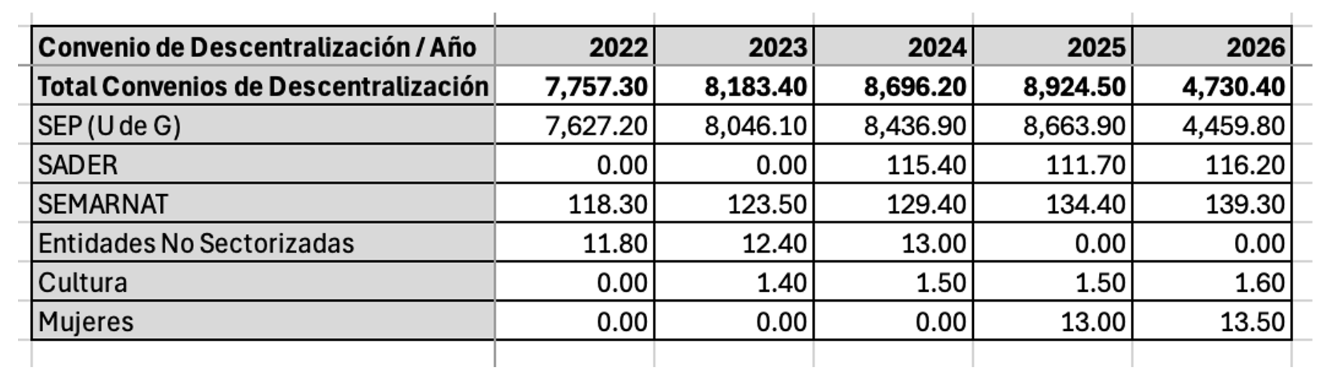 Estos acuerdos sectoriales, enfocados en educación y agricultura, crecen de 7,757.3 mdp en 2022 a 8,924.5 mdp en 2025, pero sufren un recorte severo en 2026 (4,730.5 mdp, -48.8% real). El impacto mayor es en la Secretaría de Educación Pública (SEP, incluyendo Universidad de Guadalajara, 4,459.8 mdp, -50.3% real), mientras que sectores como Agricultura (SADER, +0.5%), Medio Ambiente (SEMARNAT, +0.2%) y Cultura/Mujeres (+0.5%) tienen incrementos marginales.