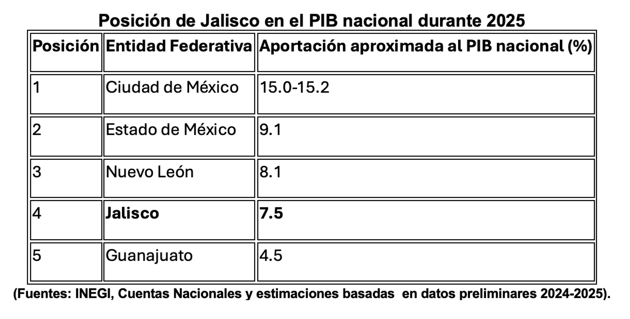 En un año marcado por la desaceleración nacional, con un Producto Interno Bruto (PIB) mexicano que apenas avanzó en torno al 0.4-1.2% en diferentes trimestres, según datos del INEGI, Jalisco emergió como un bastión de resiliencia. La entidad tapatía cerró 2025 consolidada como la cuarta economía del país, aportando aproximadamente el 7.5% del PIB nacional, solo por detrás de la Ciudad de México, el Estado de México y Nuevo León. Este desempeño no fue casual: mientras el país enfrentaba contracciones trimestrales y un entorno global de incertidumbre, Jalisco mantuvo un crecimiento moderado estimado en 1.1%, impulsado por su diversificación sectorial, la atracción de inversión extranjera y una generación de empleo que superó con creces el promedio nacional.